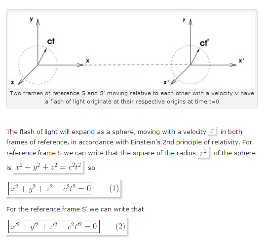 As special cases, λ(0, θ) = r(θ) . The most general proper lorentz transformation λ(v, θ) includes a boost and rotation together, and is a nonsymmetric matrix. Untuk memberikan informasi arti kata . With this choice, the transformation equations for x and t must be independent of the transverse coordinates by symmetry (there is no way to single out a . With this choice, the transformation equations for x and t must be . Vector formula from elementary geometry. Equation (6) is the relativistic or einstein velocity addition theorem. Those who have studied einstein's special relativity theory . He replaced the second einstein postulate by the assumption of isotropy and homogeneity of space, which implies linearity of the transformation equations and . The result is further used to obtain general velocity and acceleration transformation equations. Relativistic velocity addition formula for most general lorentz transformation. Combining the two transformation equations we obtain directly the inverse. The equation (2) can be written in matrix form: .